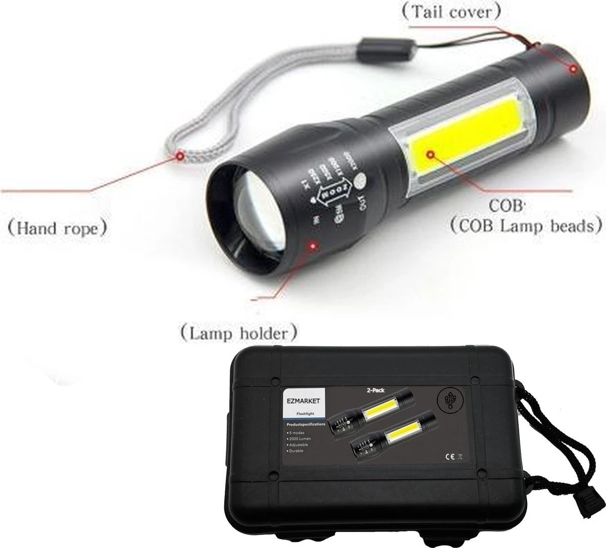 Deze oplaadbare militaire zaklamp is ideaal in talloze situaties; bij buitenactiviteiten in het donker, in en om het huis, ter zelfverdediging of in noodsituaties. De schok- en waterbestendige zaklamp is voorzien van extreem felle COB leds en heeft een 2000x zoomfunctie. Bovendien heb je geen batterijen nodig, want je kunt hem heel gemakkelijk opladen met de bijgeleverde USB-kabel. Je bestelt de 2-pack oplaadbare militaire zaklamp nu voor slechts 26.95