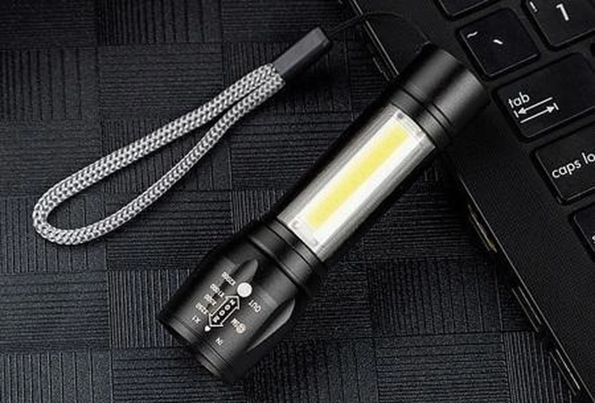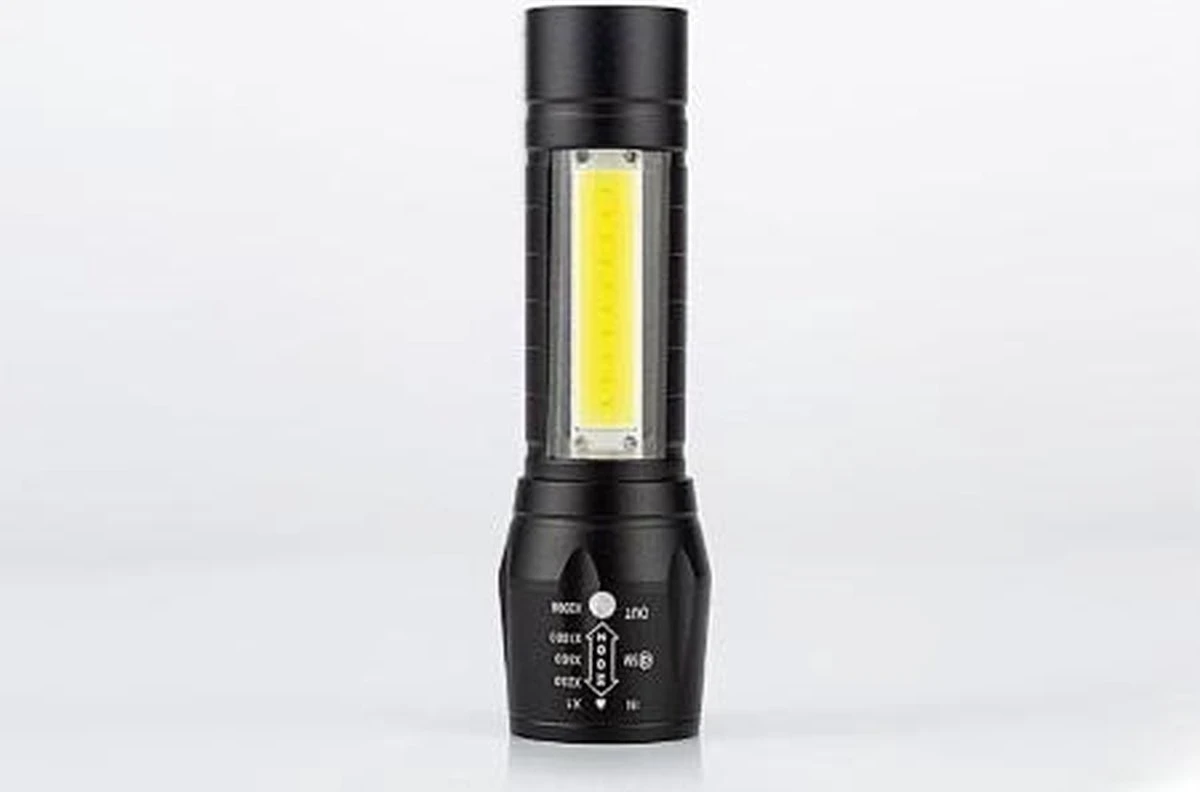 Deze militaire zaklamp is super handig om in huis te hebben. Een ware gadget die altijd wel van pas komt! De COB led-technologie in deze zaklamp zorgt voor een extreem fel licht maar liefst 2000 lumen. Perfect voor op de camping, tijdens een nachtelijke wandeling of om eventuele indringers te verblinden. Wanneer je de oplaadbare zaklamp op 1x zoom-stand zet, is het licht wel 100x feller dan een cameraflitser. Wil je een groter oppervlak verlichten? Gebruik dan de 2000x zoom zodat je meer ziet in het donker. Dankzij de extra grote COB led-strip in het handvat kun je eventueel nóg grotere ruimtes verlichten.