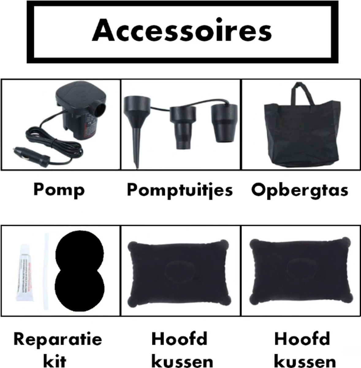 Het luchtbed is makkelijk en snel te installeren en ook in een handomdraai weer opgeborgen. Leg de achterbank helemaal plat, vouw het luchtbed uit en blaas deze op met de bijgeleverde automatische pomp. Deze kun je in de sigarettenaansteker van je auto inpluggen. De set wordt ook geleverd met 2 stuks opblaasbare hoofdkussens en ondersteuningskussens. Deze laatste kunnen gebruikt worden om het luchtbed als eenpersoons op de achterbank te plaatsen en ondersteuning te bieden in de lege ruimte tussen de achterbank en de voorste stoelen. De hoofdkussens en ondersteuningskussens kunnen gemakkelijk zelf opgeblazen worden.