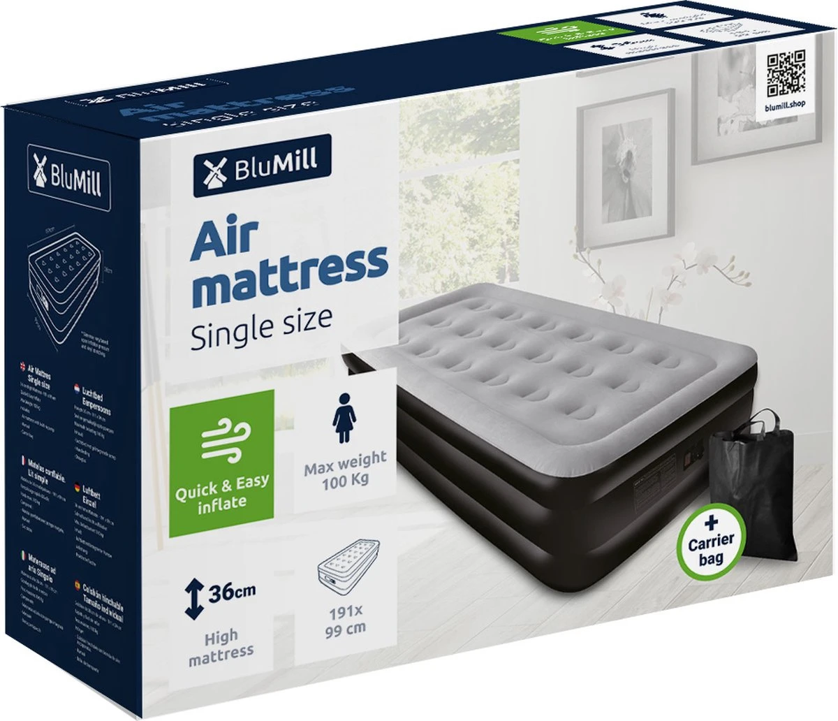 Het BluMill Luchtbed combineert comfort en stabiliteit door het gebruik van unieke air cell technologie, dat u en uw gast een goede nachtrust garandeert. De met lucht gevulde kern en interne lagen ondersteunen het lichaam op natuurlijke wijze, waardoor de wervelkolom op één lijn blijft terwijl u slaapt. De stevigheid kunt u helemaal afstemmen naar eigen voorkeur. Het opblaasbare bed is gebouwd met een elektrische pomp met draaischakelaar, waardoor hij makkelijk opblaast en leegloopt binnen 3-5 minuten. Sluit eenvoudig de ingebouwde pomp aan en hij blaast automatisch van gecomprimeerd naar super stevig en is daarbij stiller dan andere luchtbedden.