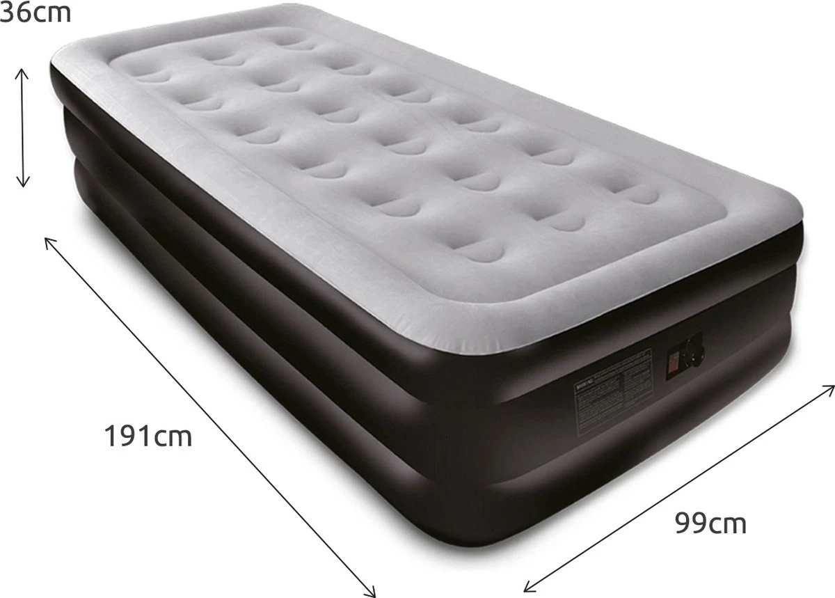 Het luchtbed heeft een zachte bovenkant van grijs velours en een verhoging van 36 cm, zodat u er ‘s nachts niet af kunt rollen en het aanvoelt als een echt bed. Dankzij de naadloze lastechniek en kwalitatieve dikke materiaal is het bed volledig luchtdicht, lekbestendig, waterafstotend en bestand tegen beschadigingen. Bovendien zorgt de antislip onderkant voor extra stevigheid.