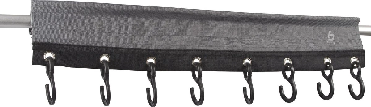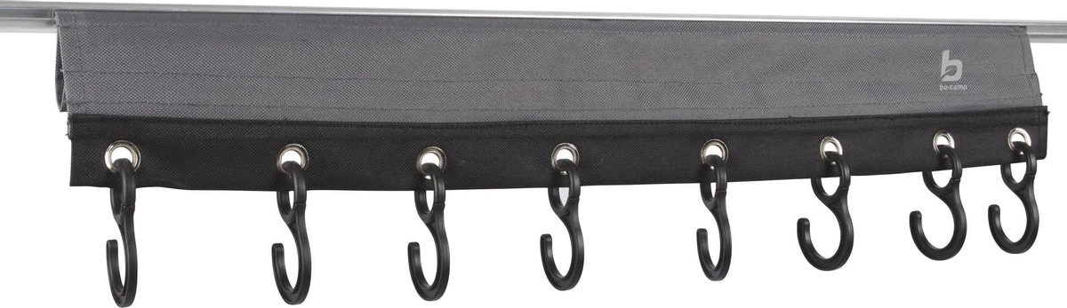 Een universele kapstok met 8 haken. Kan eenvoudig met klittenband worden bevestigd aan de nokstok of met de pees aan een caravanrail. Geschikt voor een tentstok met een maximale diameter van 40 millimeter.