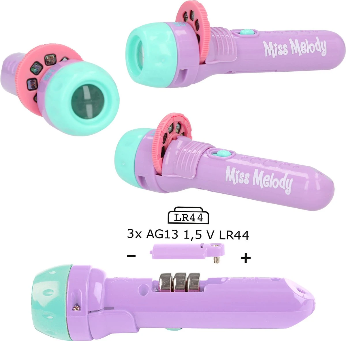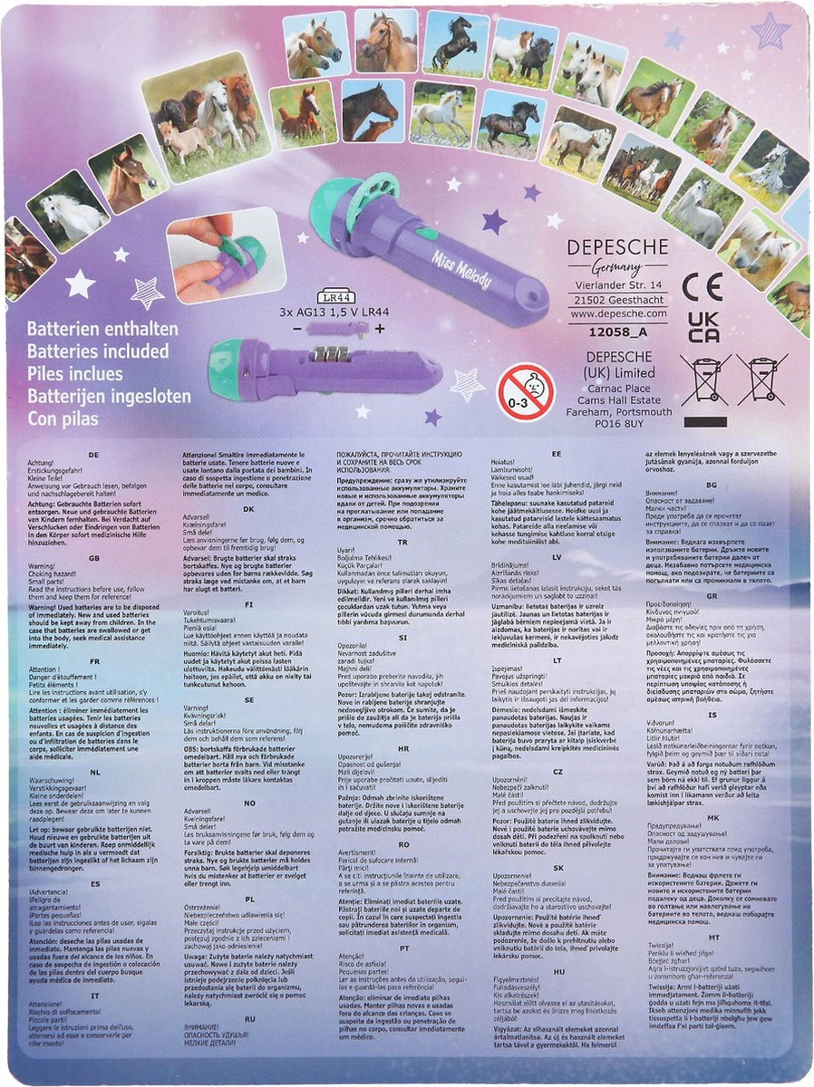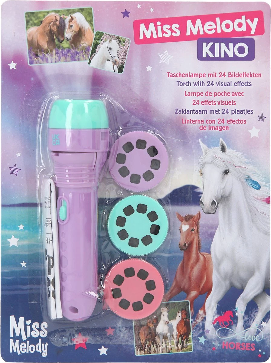 Welkom in de paardenbioscoop! De zaklantaarn van Miss Melody in paars en turquoise heeft drie projectoren met elk acht paardenplaatjes die met de zaklantaarn op de muur geprojecteerd kunnen worden. 3x LR 44 batterijen ingesloten.