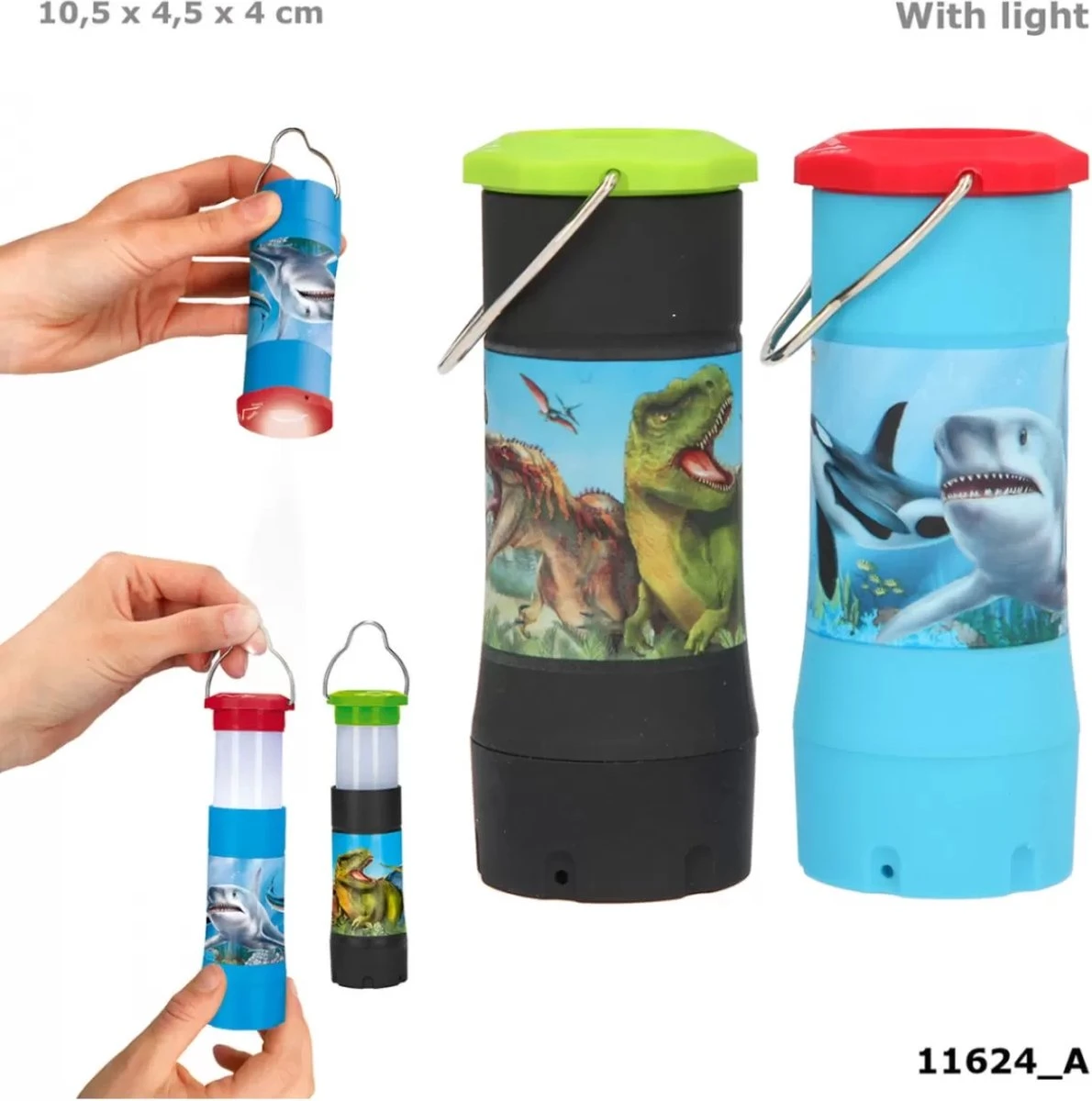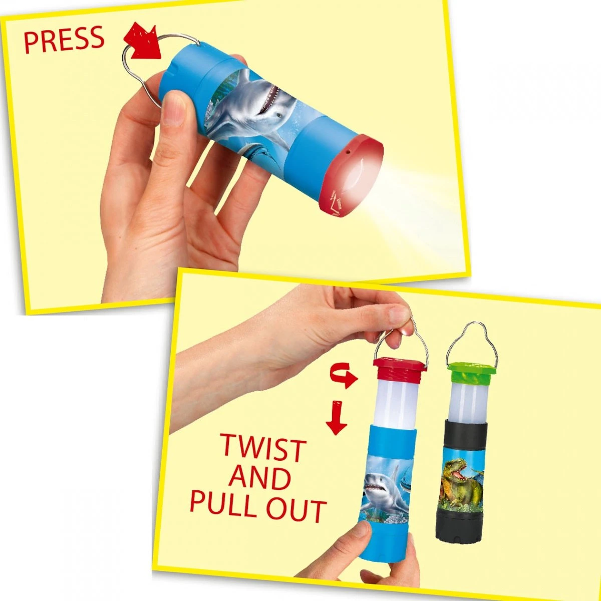 Door de draaien en te trekken aan deze coole zaklamp kun je hem ook als lantaarn gebruiken. De zaklamp is voorzien van een gave afbeelding van een haai en wordt geleverd met batterijen. Zo kun jij meteen op avontuur!