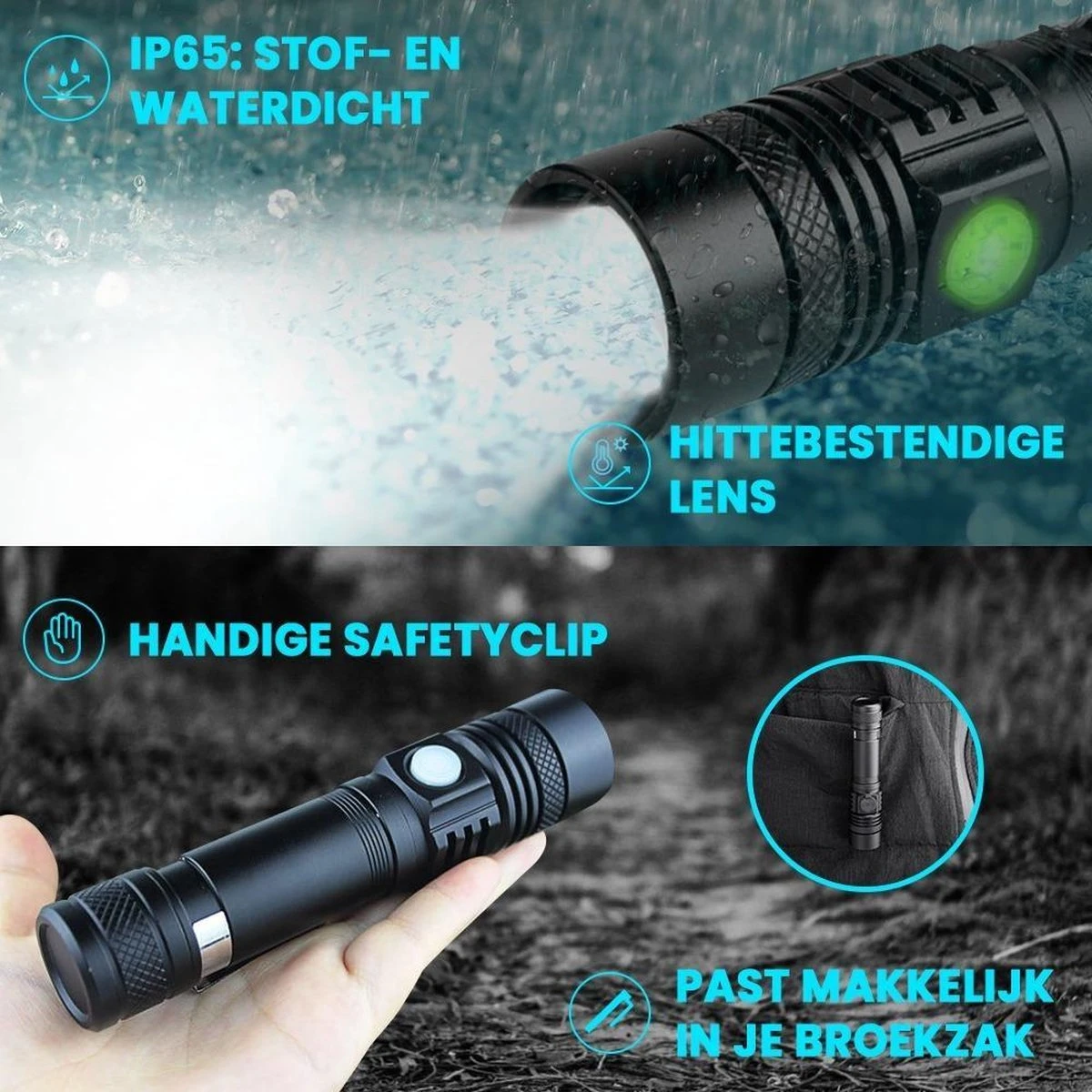 De zaklamp is ontworpen voor militair gebruik en is daardoor onverwoestbaar, water- en stofdicht (IP-65). Hij is gemaakt van duurzaam en sterk zwart luchtvaart aluminium. Zo sterk zelfs, dat je er een ruit mee kan inslaan als het nodig is. Gebruik deze alleskunner tijdens een kampeervakantie, bij het survivallen, met autopech, bij stroomuitval, het nachtvissen of tijdens een klus. Door het compacte design en de safetyclip hang je hem gemakkelijk aan je broek en neem je hem overal mee naartoe. Door het lichte gewicht en de ergonomische grip ligt de zaklamp ook bij langdurig gebruik lekker in de hand.