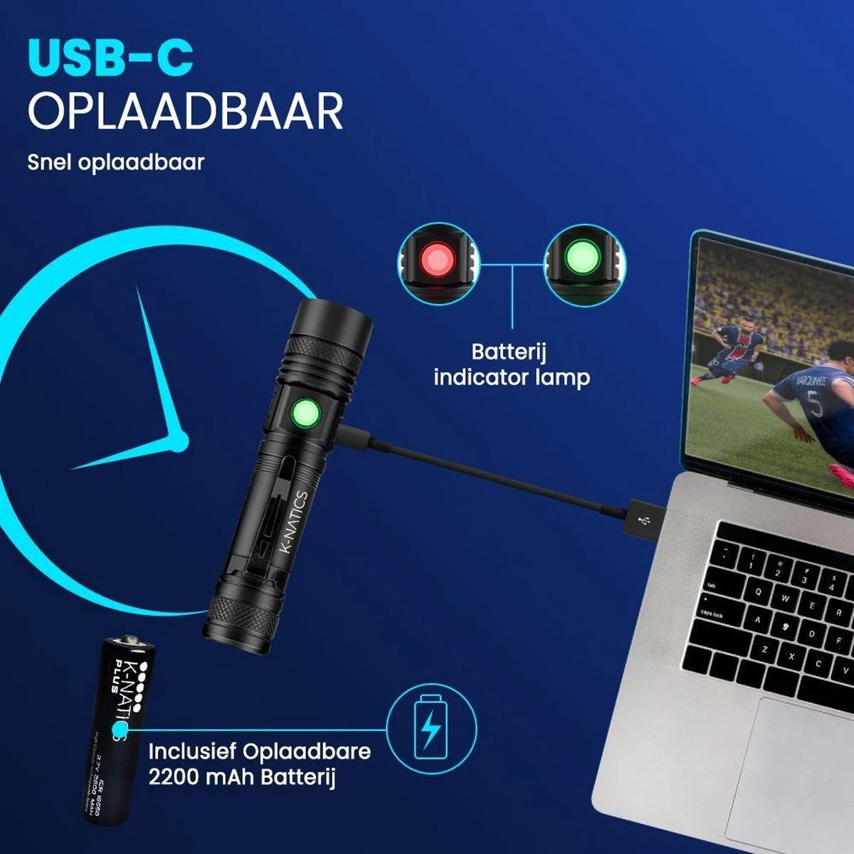 - Extra krachtige K-NATICS Super 2200mA oplaadbare lithium batterij