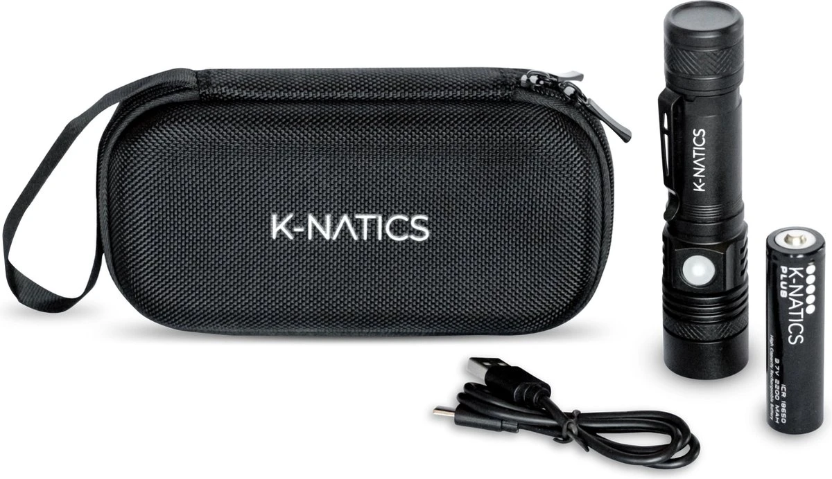 Met de K-NATICS LITE oplaadbare LED zaklamp hoef je nooit meer bang te zijn in het donker! Schijn extra ver met deze revolutionaire oplaadbare zaklamp! Deze K-NATICS stof- en waterdichte militaire zaklamp heeft in zijn felste stand een lichtopbrengst van 1500 lumen. Heb je de meegeleverde K-NATICS 2200mA PLUS batterij helemaal opgeladen? Dan gaat hij in zijn krachtigste stand maar liefst 4-10 uur mee! Maak je nooit meer zorgen dat je tijdens jouw nachtwandeling of survivaltrip in het donker komt te zitten. Naast de supersterke batterij, wordt deze zaklamp geleverd met safetyclip in een stevige foamcase en een moderne USB-C laadkabel.