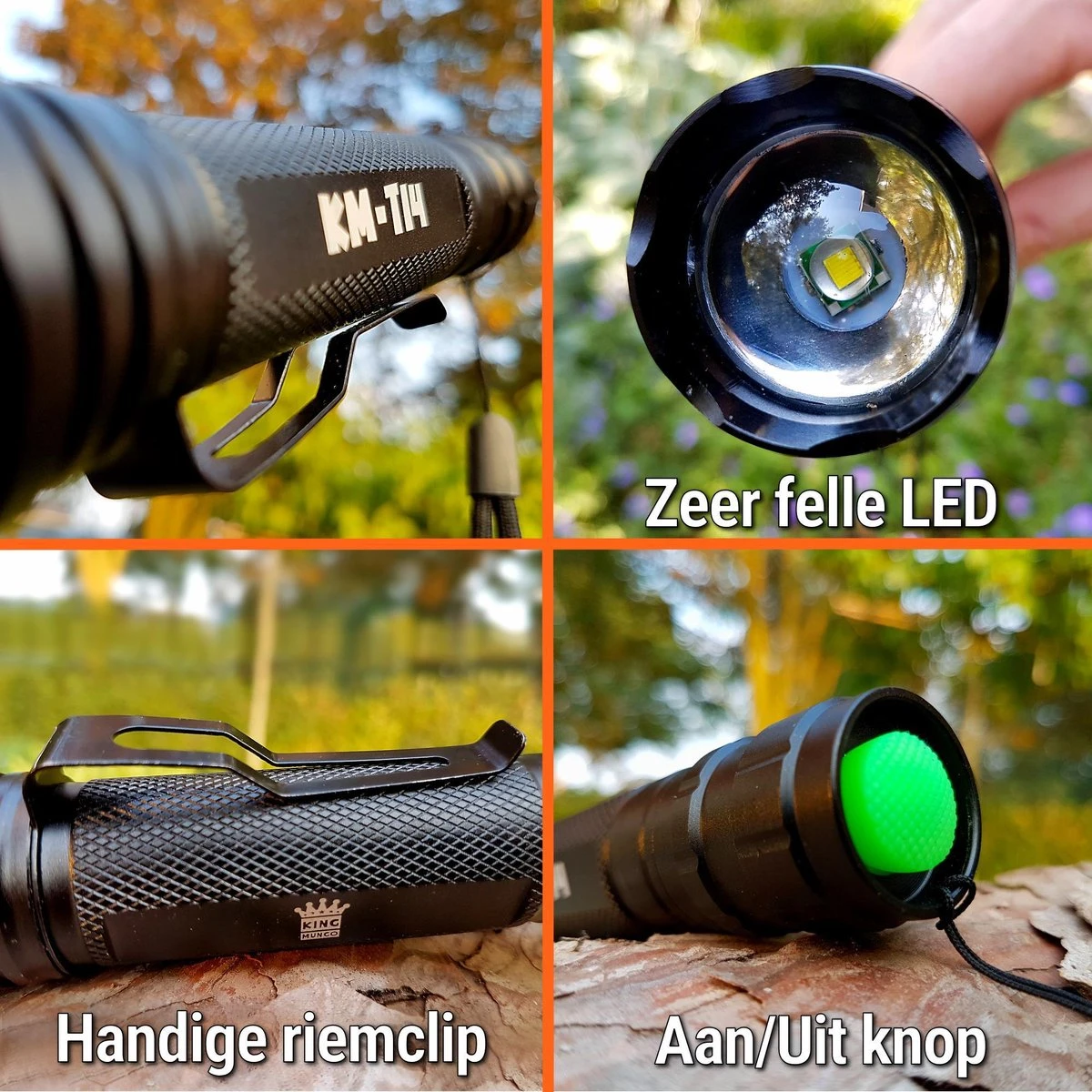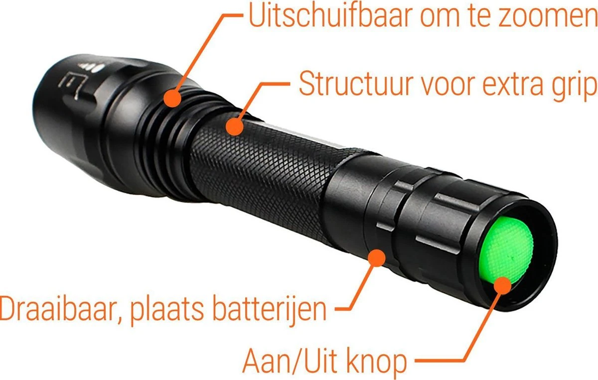 alle outdoor activiteiten zoals kamperen, vissen, wandelen, hond uitlaten, fietsen en scouting. Deze ledzaklamp heeft meerdere lichtfuncties en in geval van nood heeft deze tactical zaklamp van King Mungo (KM-T14) ook een SOS signaal. Met de handige zoomfunctie kun je gemakkelijk zoomen door de kop van de lamp heen en weer te schuiven.