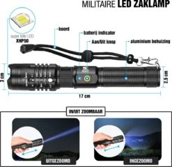 Verbeterde Militaire LED Zaklamp Incl. Opbergdoos Batterij En Diverse Laders – 1200 Lumen – Zwart