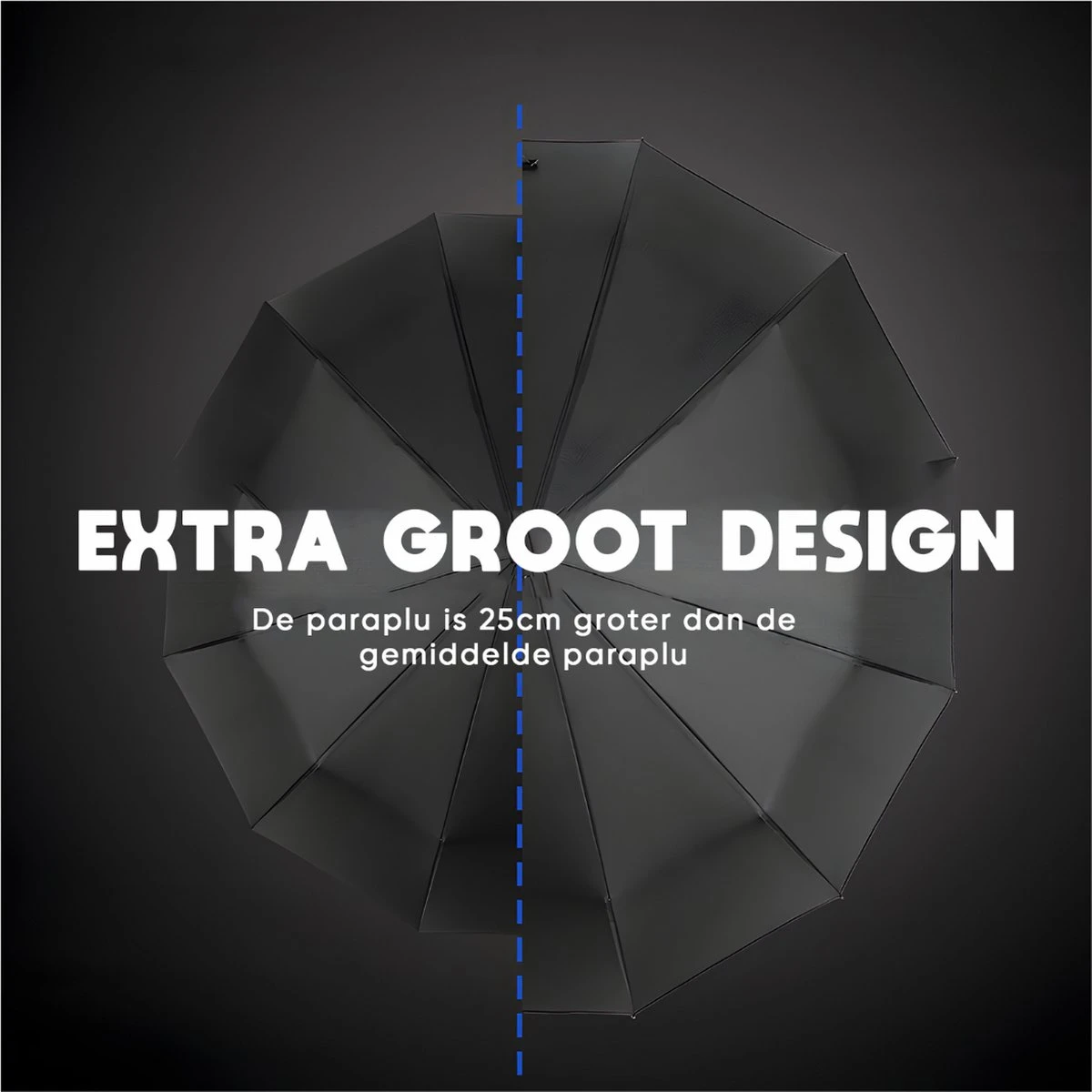Aluminium stok, glasfiber frame met versterkte scharnierpunten, zwart rubber gecoat handvat, met foedraal. De stormparaplu zorgt voor maximale bescherming tegen regen!