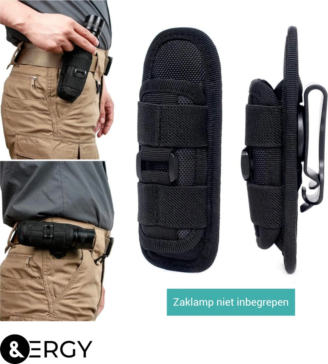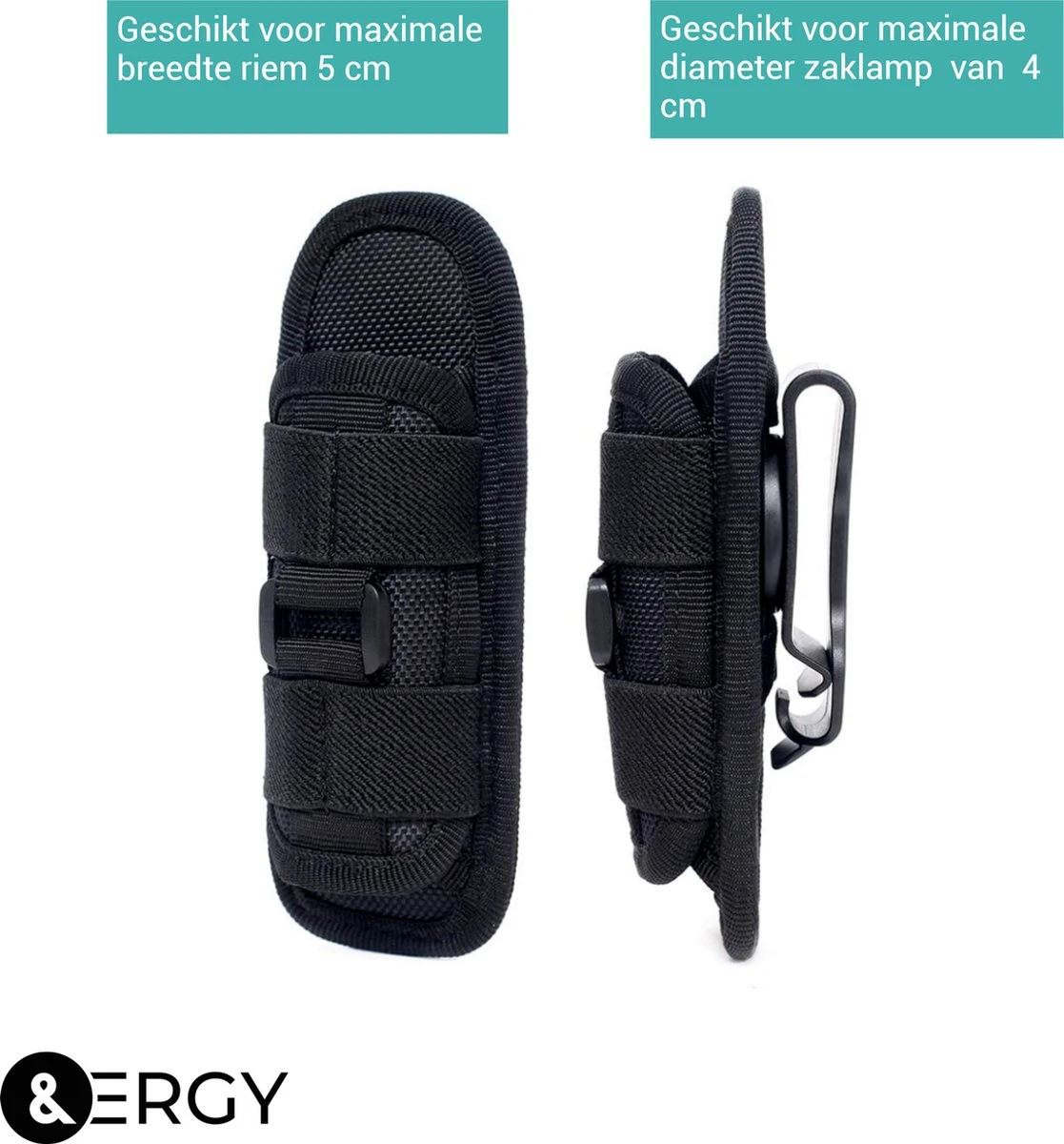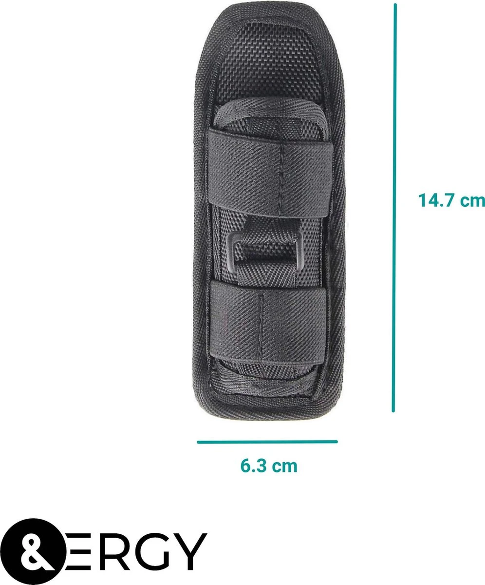Deze zaklamp houder van het merk &ERGY® is gemaakt van 100% nylon en daarmee van goede kwaliteit. Middels de bevestigingsclip is het gemakkelijk om de zaklamp houder aan de broekriem te bevestigen. De clip is 360 graden roteerbaar waardoor de houder in elke gewenste positie bevestigd kan worden aan de broekriem.
